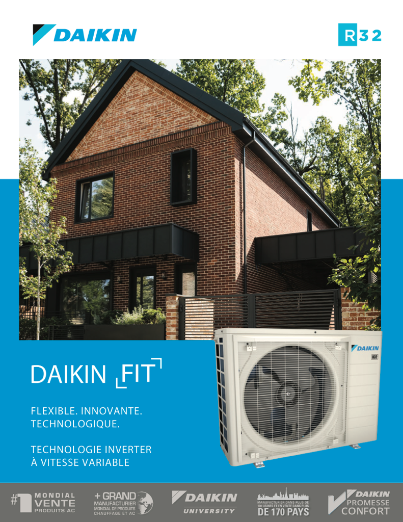 La Daikin Fit est un système CVAC intelligent à évacuation frontale maximisant tant le confort à l’intérieur qu’à l’extérieur. Son faible niveau sonore rend le fonctionnement de l’appareil ultrasilencieux. Cette thermopompe, vous donnes un rendement jusqu’à -30˚C. De plus, le profil compact de l’unité extérieure offre des solutions d’installation là où un appareil conventionnel ne le peut pas, ça fit! Lorsque l’espace est limité, le système central compact Daikin Fit répond facilement aux exigences des endroits contraignants. Une technologie Inverter abordable qui ne fait réellement pas de compromis! - daikinquebec.net